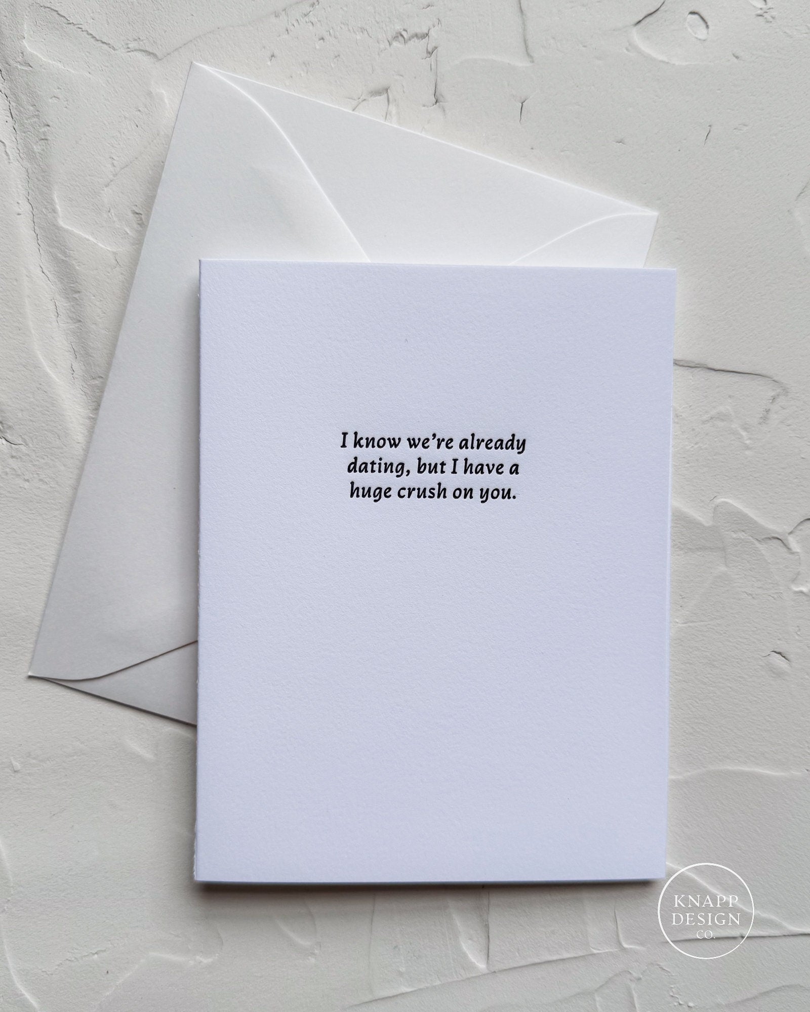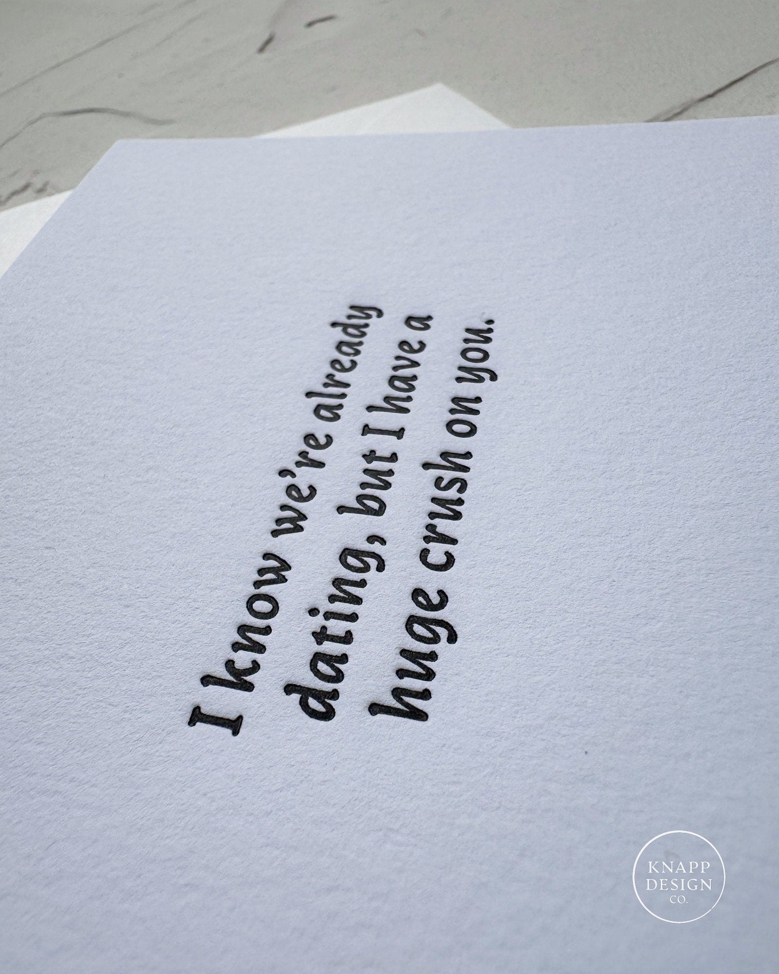 Single color letterpress greeting card with "I know we're already DATING, but I have a huge crush on you.”. A sweet and cheesy card to give to your significant other.