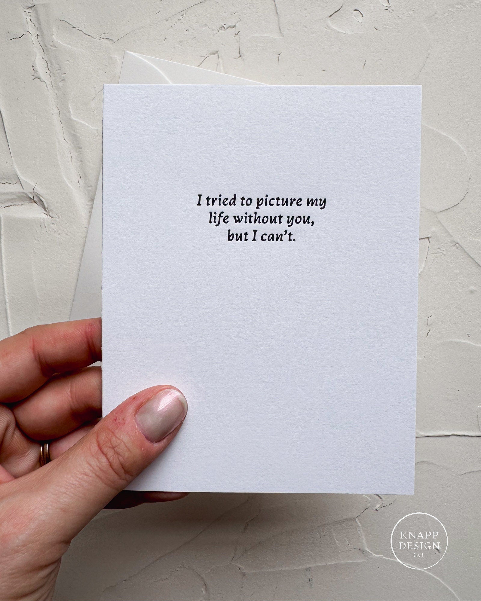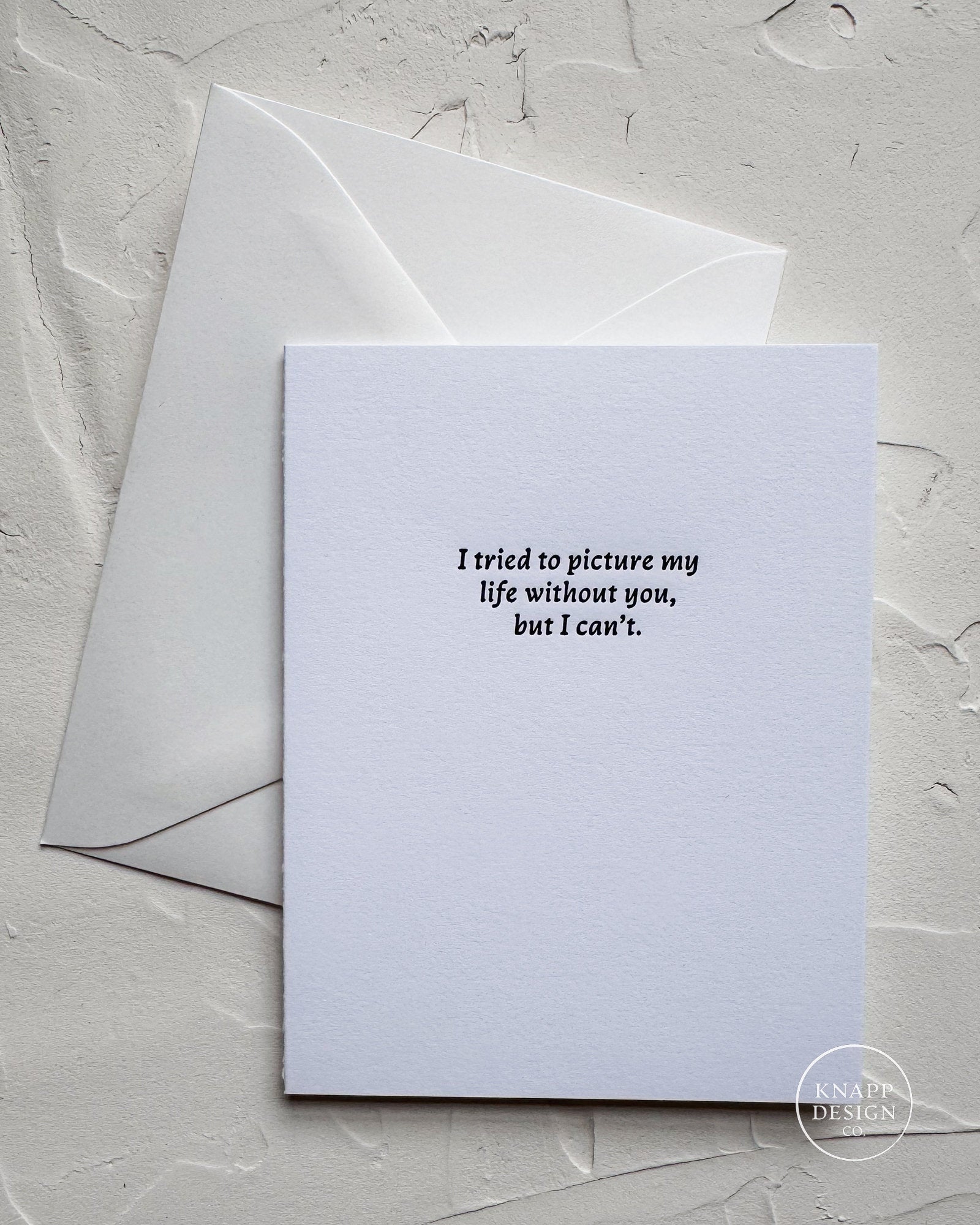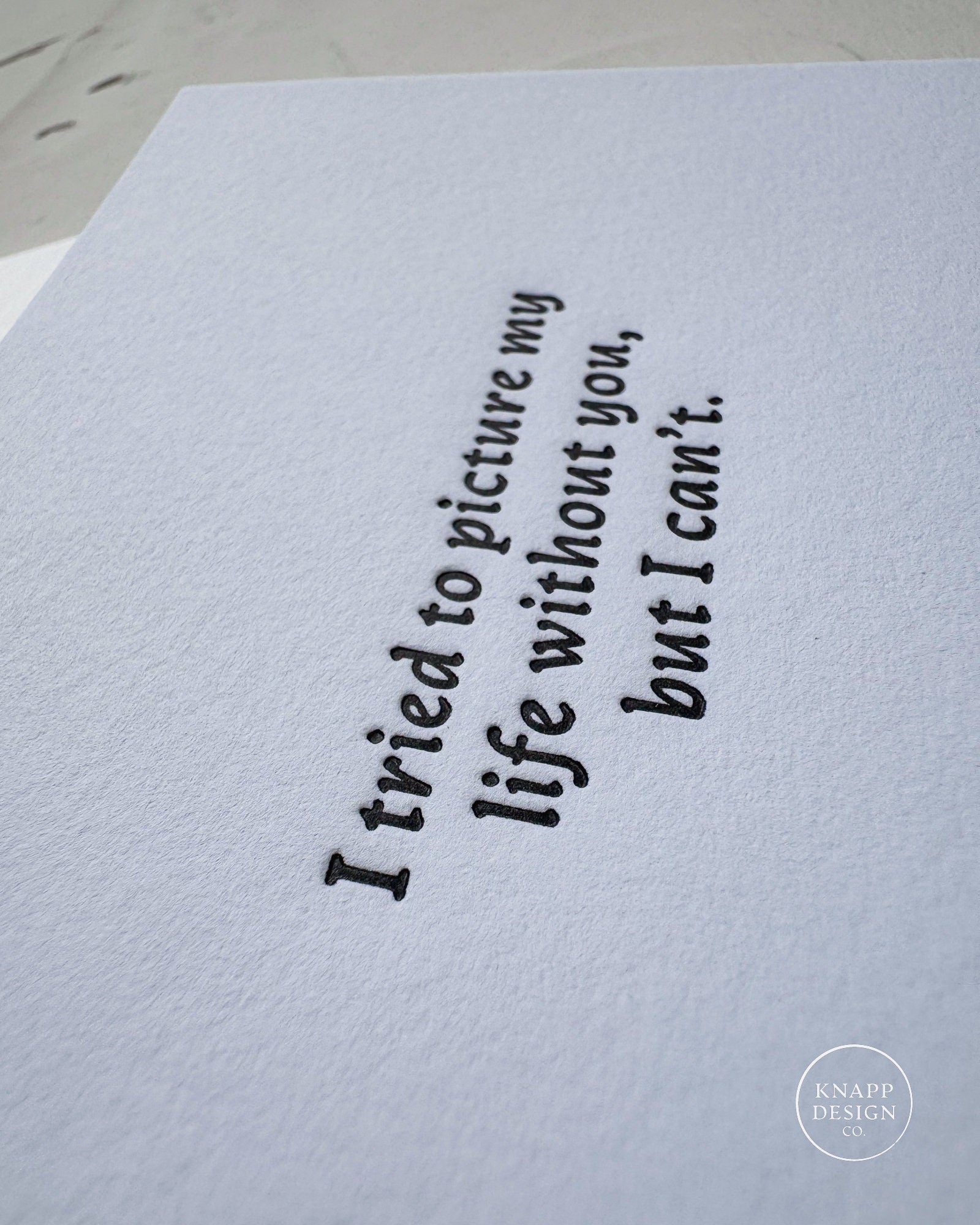 Single color letterpress greeting card with "I tried to picture my life without you, but I can't”. A sweet and cheesy card to give to your significant other.