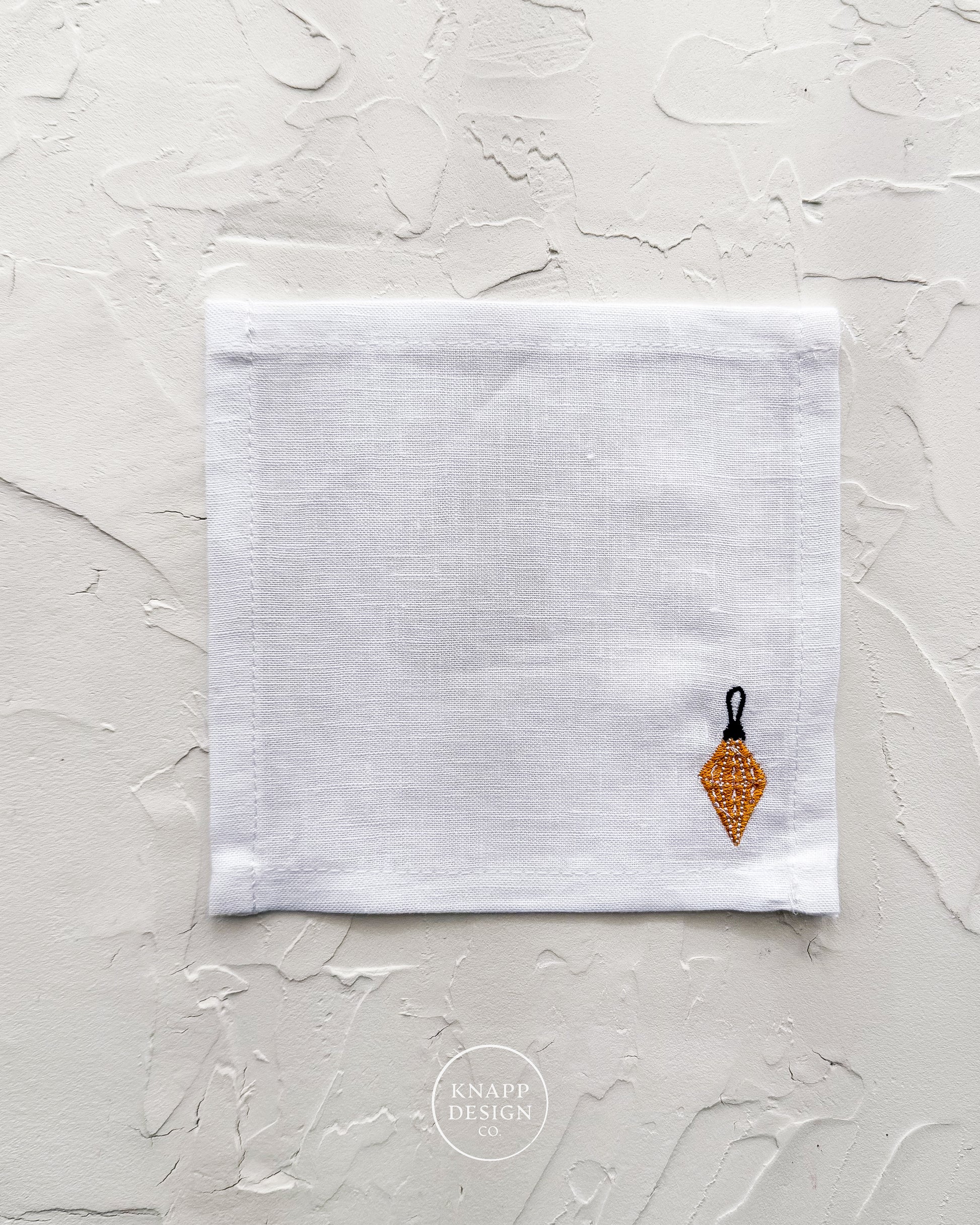 These linen cocktail-sized napkins bring our holiday illustrations to life in a whole new way. Each design is digitized and embroidered in-house for crisp detail, rich color, and a textile version of our signature holiday artwork. Perfect for festive hosting, gifting, or elevating your bar cart all season long.