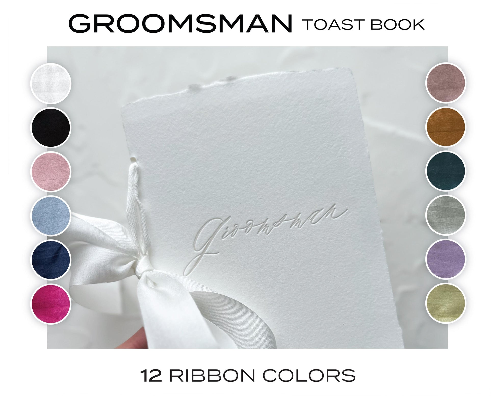 The perfectly sized toast book is made for once-in-a-lifetime words. Letterpress printed with “Groomsman” on handmade cotton paper and tied with silk ribbon, this heirloom-quality piece is the perfect way for you to share your toast with the newlyweds.