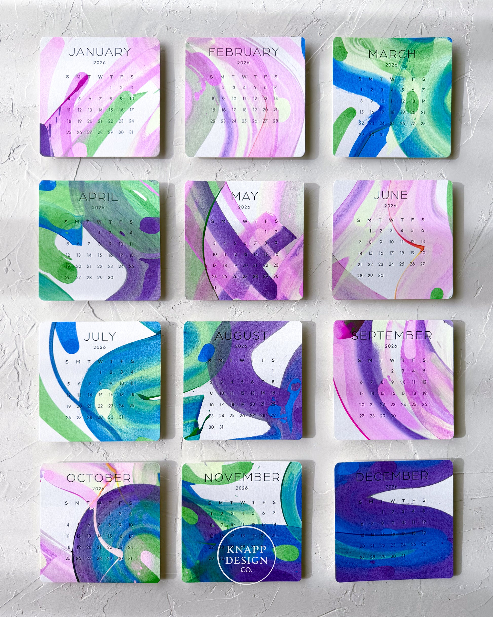 Brighten your workspace all year long with this hand-painted 2026 desk calendar, created in the Knapp Design Co. studio. Each month features its own original acrylic wash, soft pastels, layered strokes, and organic shapes, making every page a tiny piece of art.