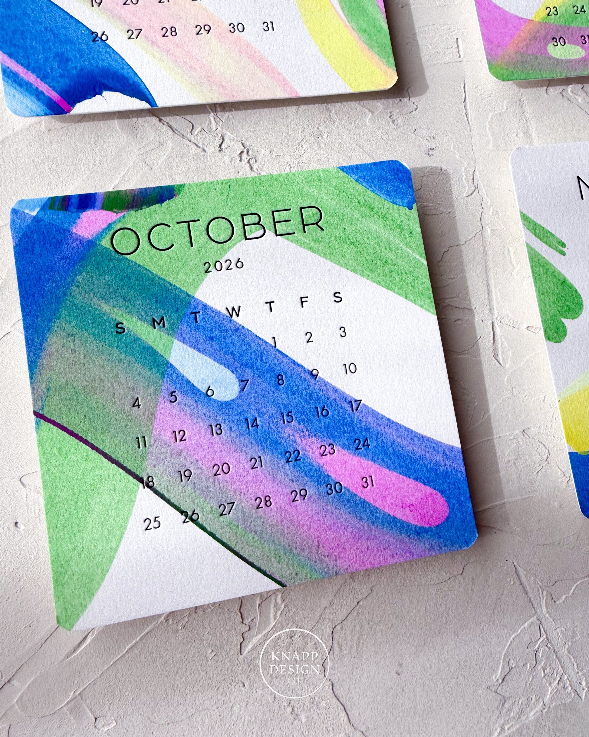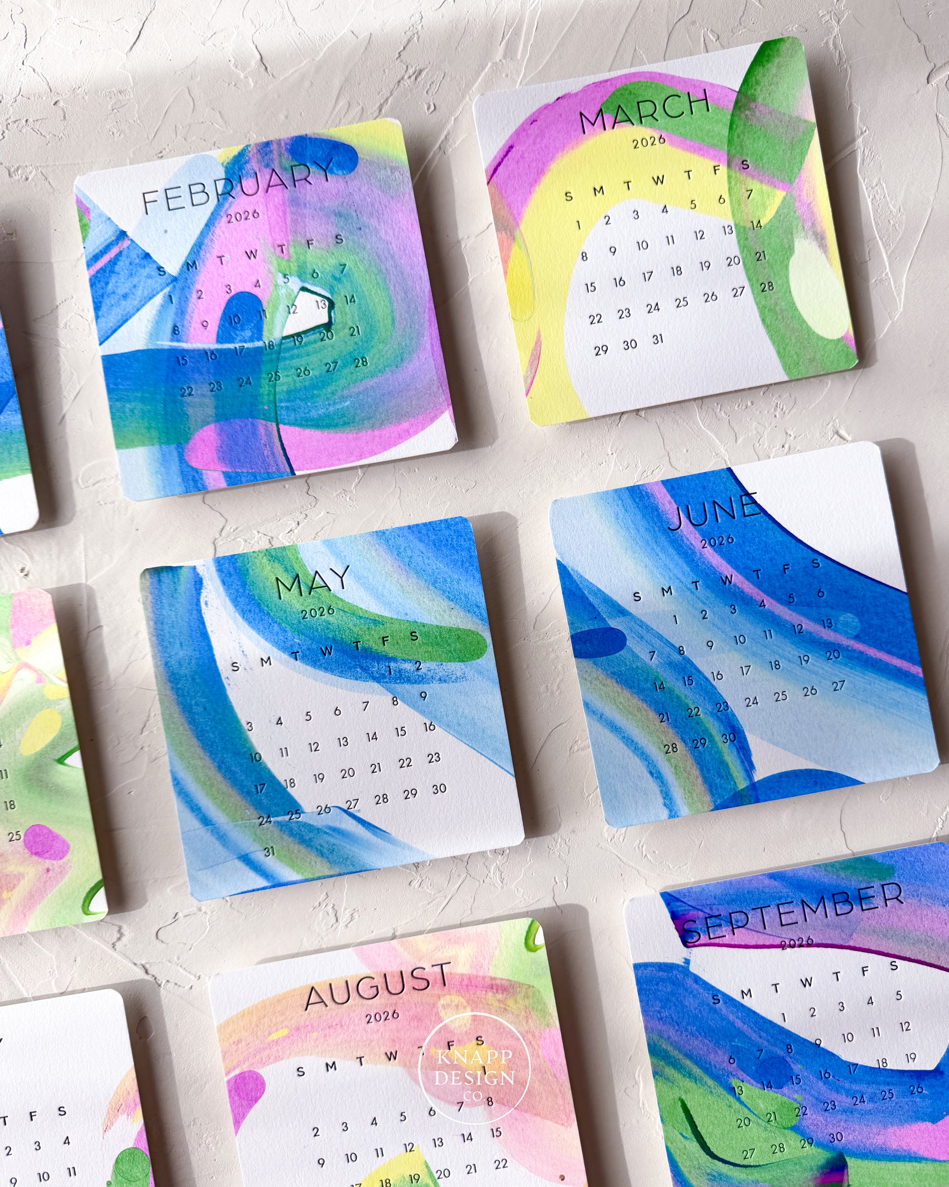 Brighten your workspace all year long with this hand-painted 2026 desk calendar, created in the Knapp Design Co. studio. Each month features its own original acrylic wash, soft pastels, layered strokes, and organic shapes, making every page a tiny piece of art.