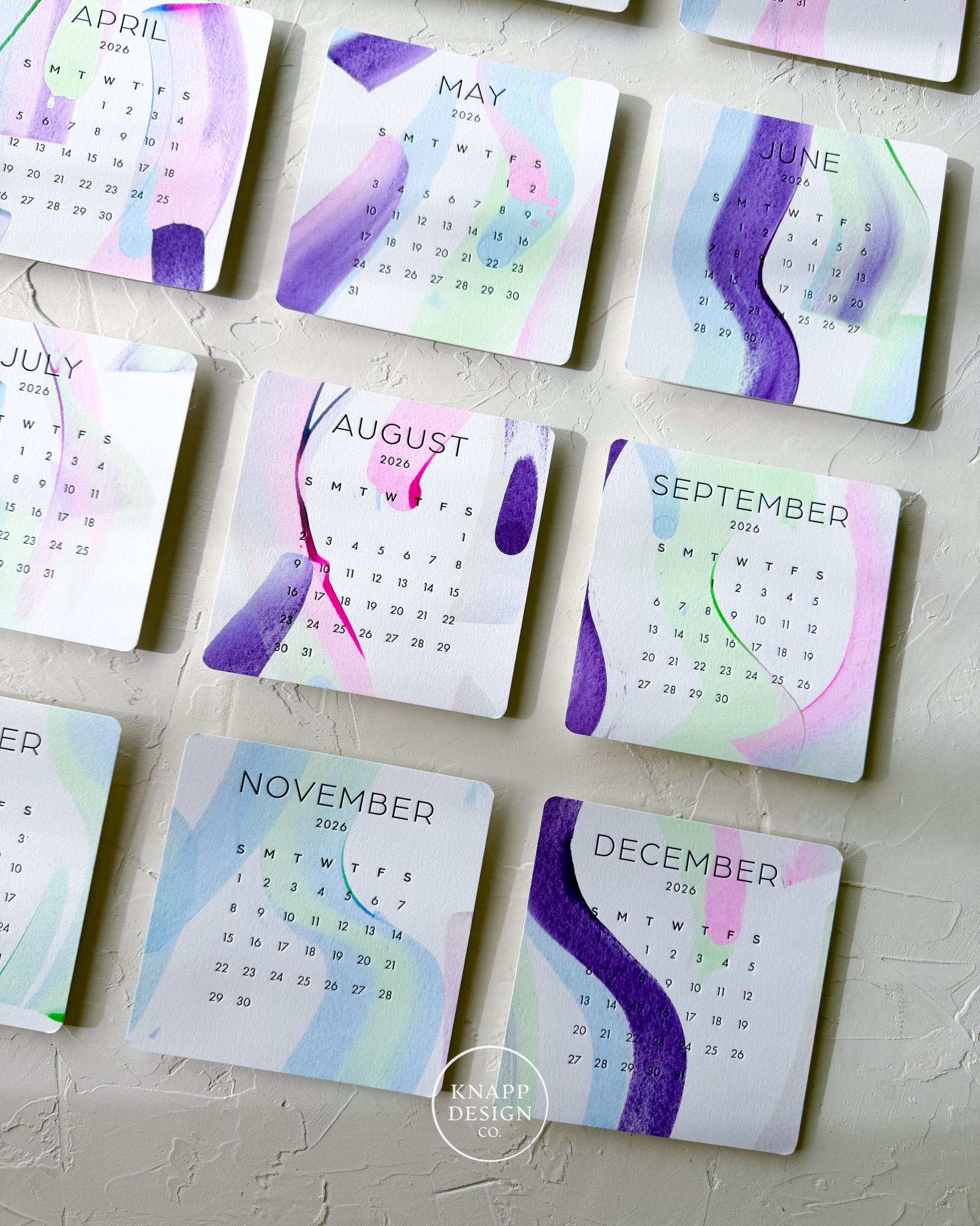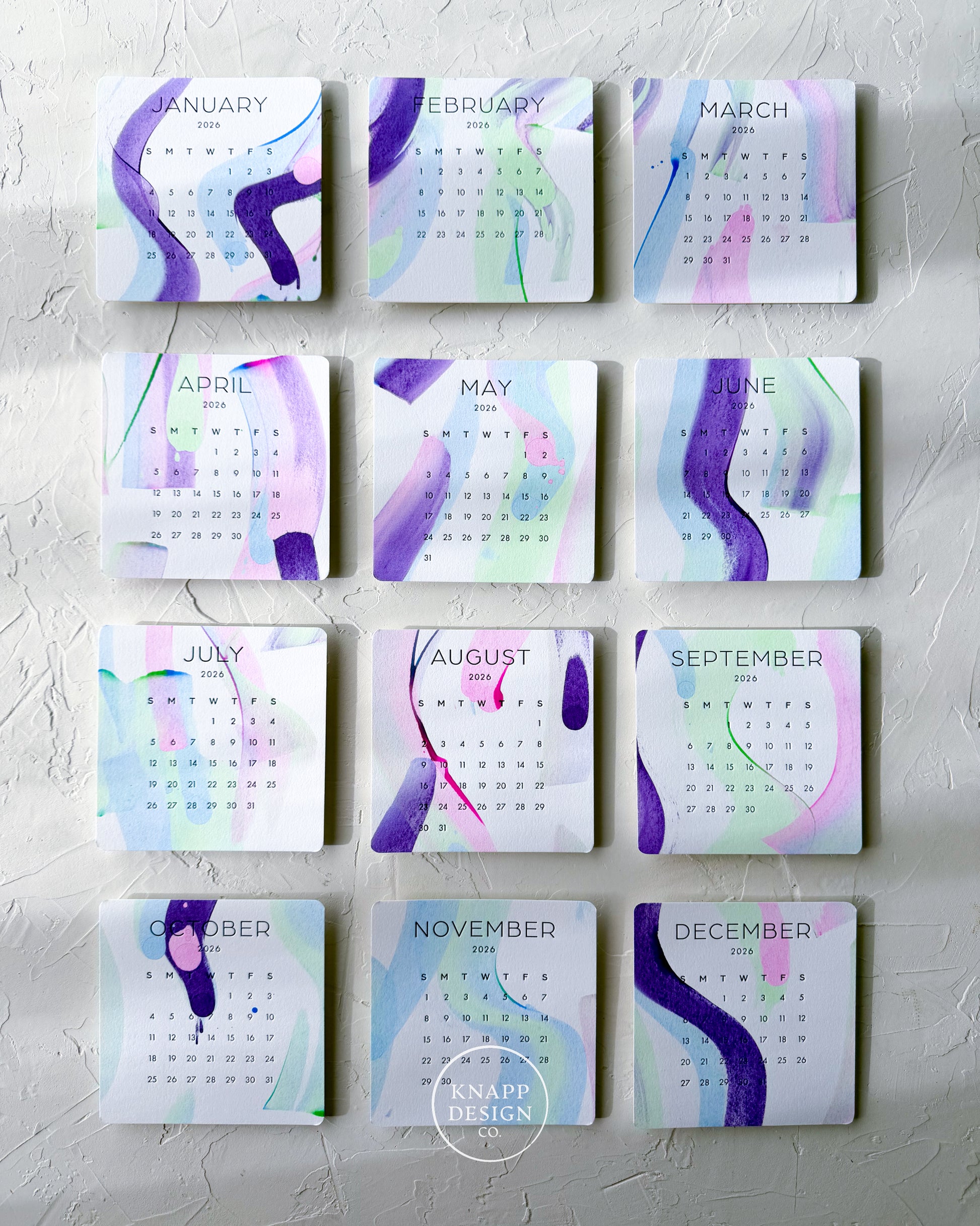 Brighten your workspace all year long with this hand-painted 2026 desk calendar, created in the Knapp Design Co. studio. Each month features its own original acrylic wash, soft pastels, layered strokes, and organic shapes, making every page a tiny piece of art.