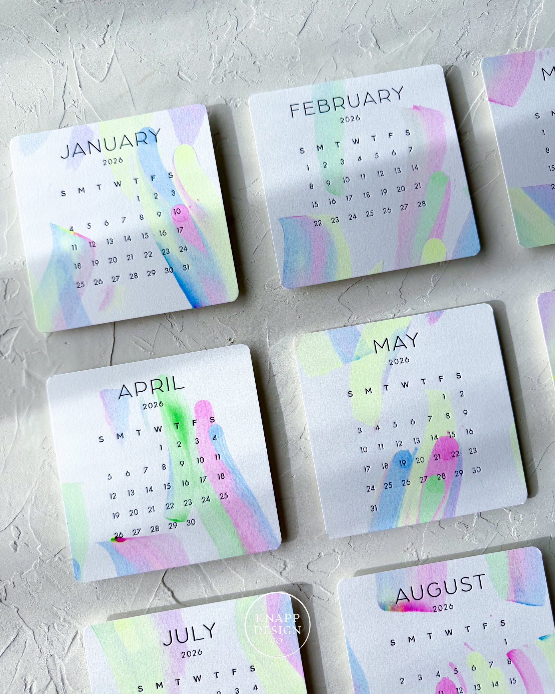 Brighten your workspace all year long with this hand-painted 2026 desk calendar, created in the Knapp Design Co. studio. Each month features its own original acrylic wash, soft pastels, layered strokes, and organic shapes, making every page a tiny piece of art.
