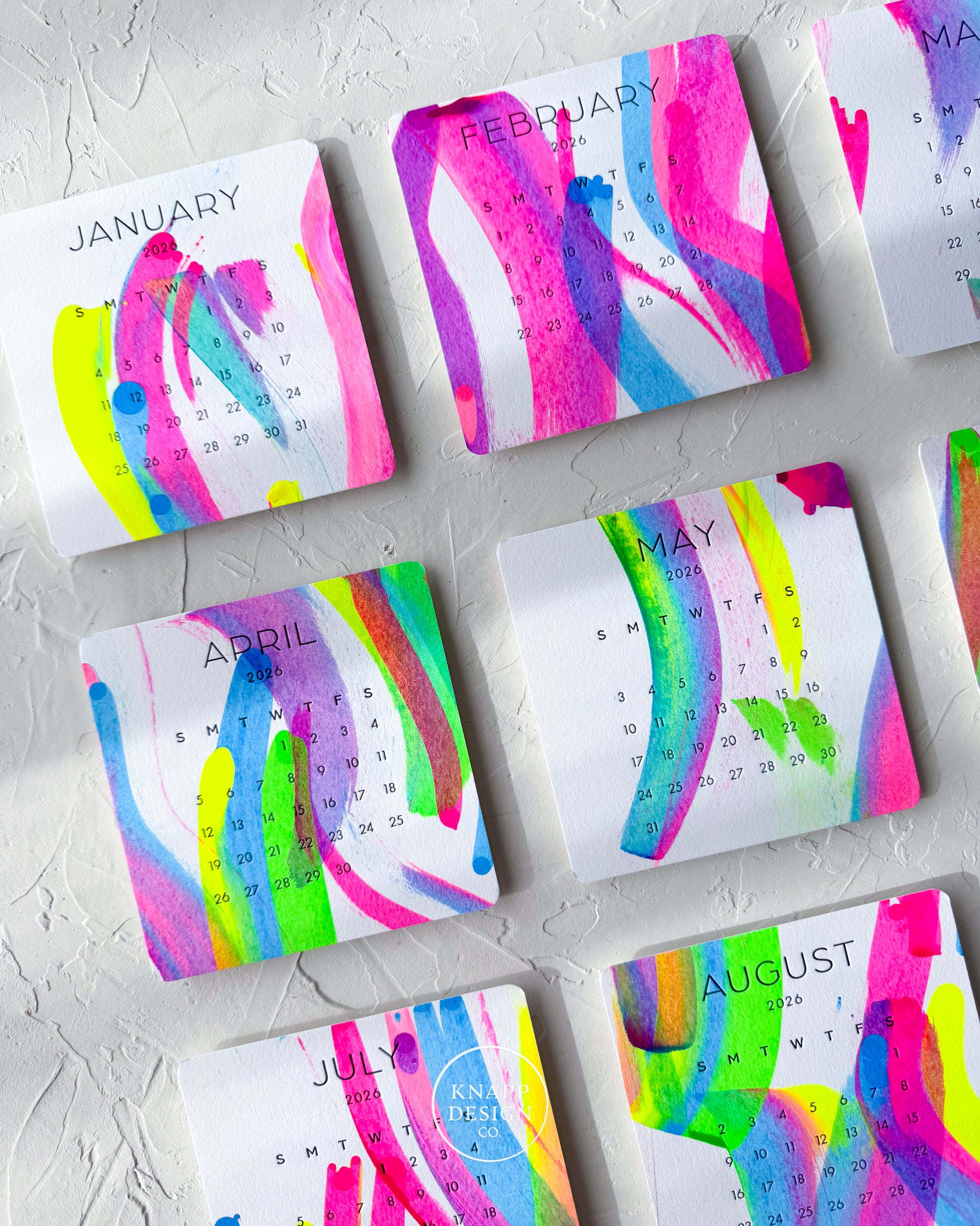 Brighten your workspace all year long with this hand-painted 2026 desk calendar, created in the Knapp Design Co. studio. Each month features its own original acrylic wash, soft pastels, layered strokes, and organic shapes, making every page a tiny piece of art.