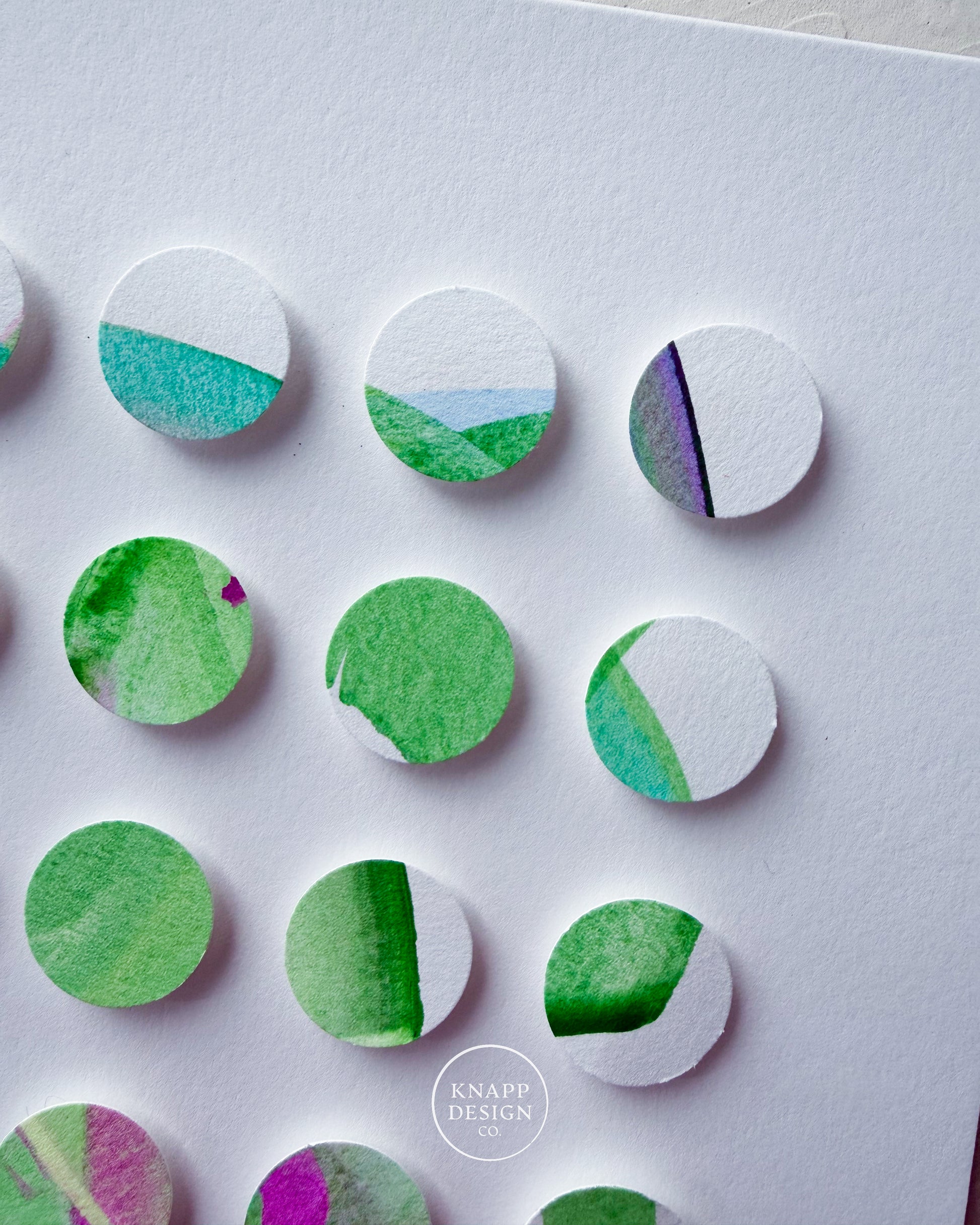 Every dot features its own miniature color wash with vibrant greens, blues and a dash of pink, making the composition feel playful, balanced, and quietly intentional.