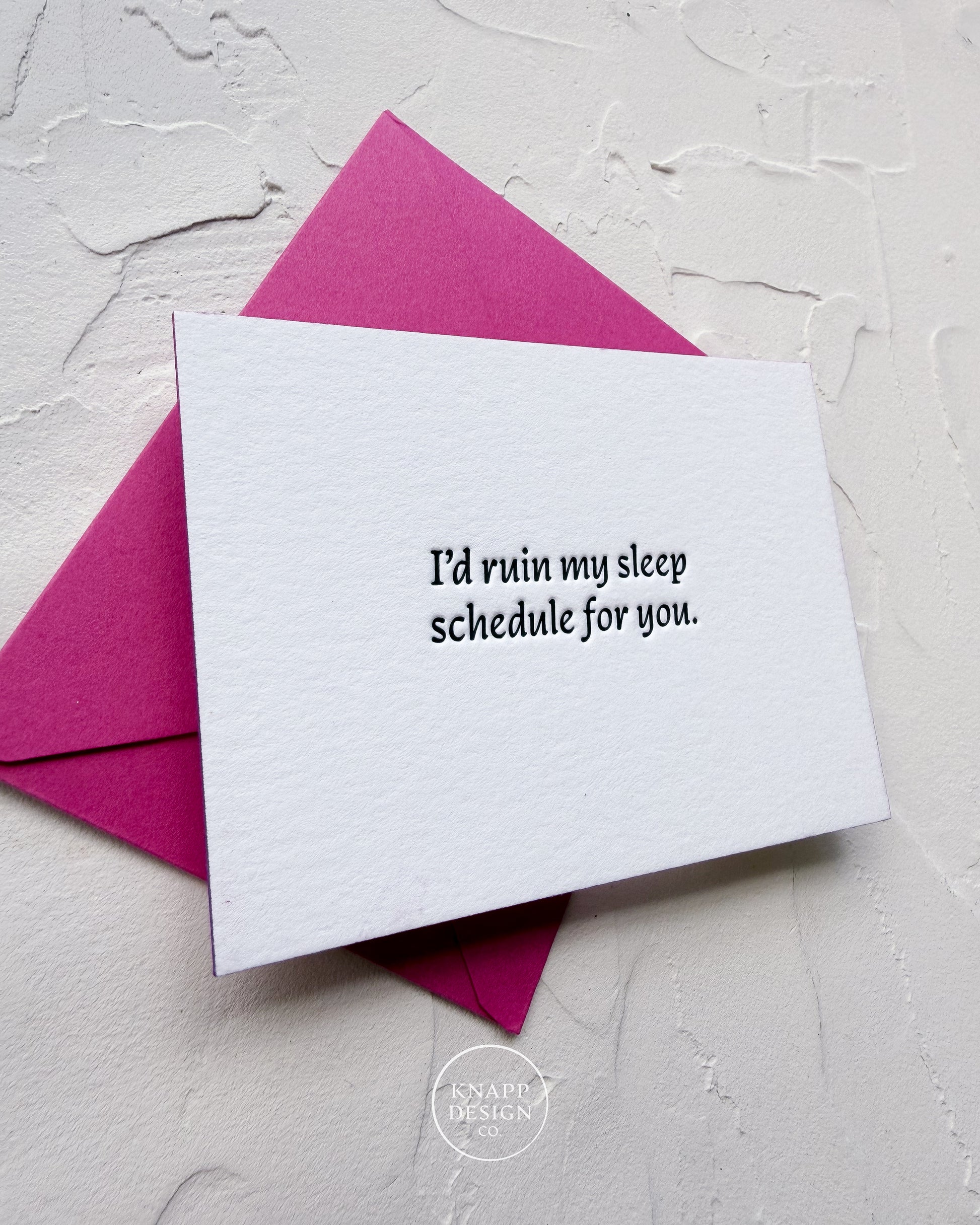 ♥️ Letterpress printed on one side with the phrase “I’d ruin my sleep schedule for you.”
