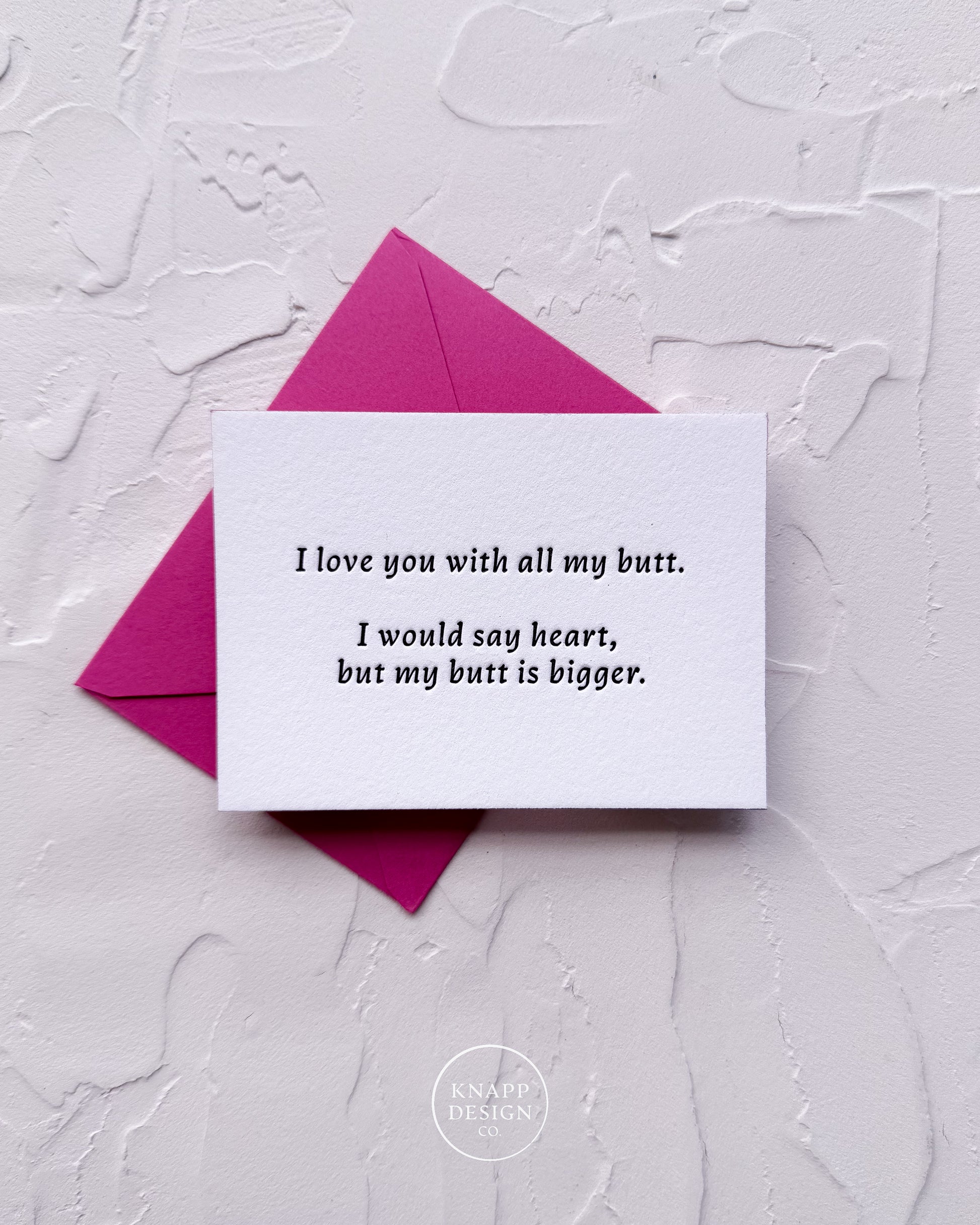 ♥️ Letterpress printed on one side with the phrase "I love you with all my butt. I would say heart, but my butt is bigger"