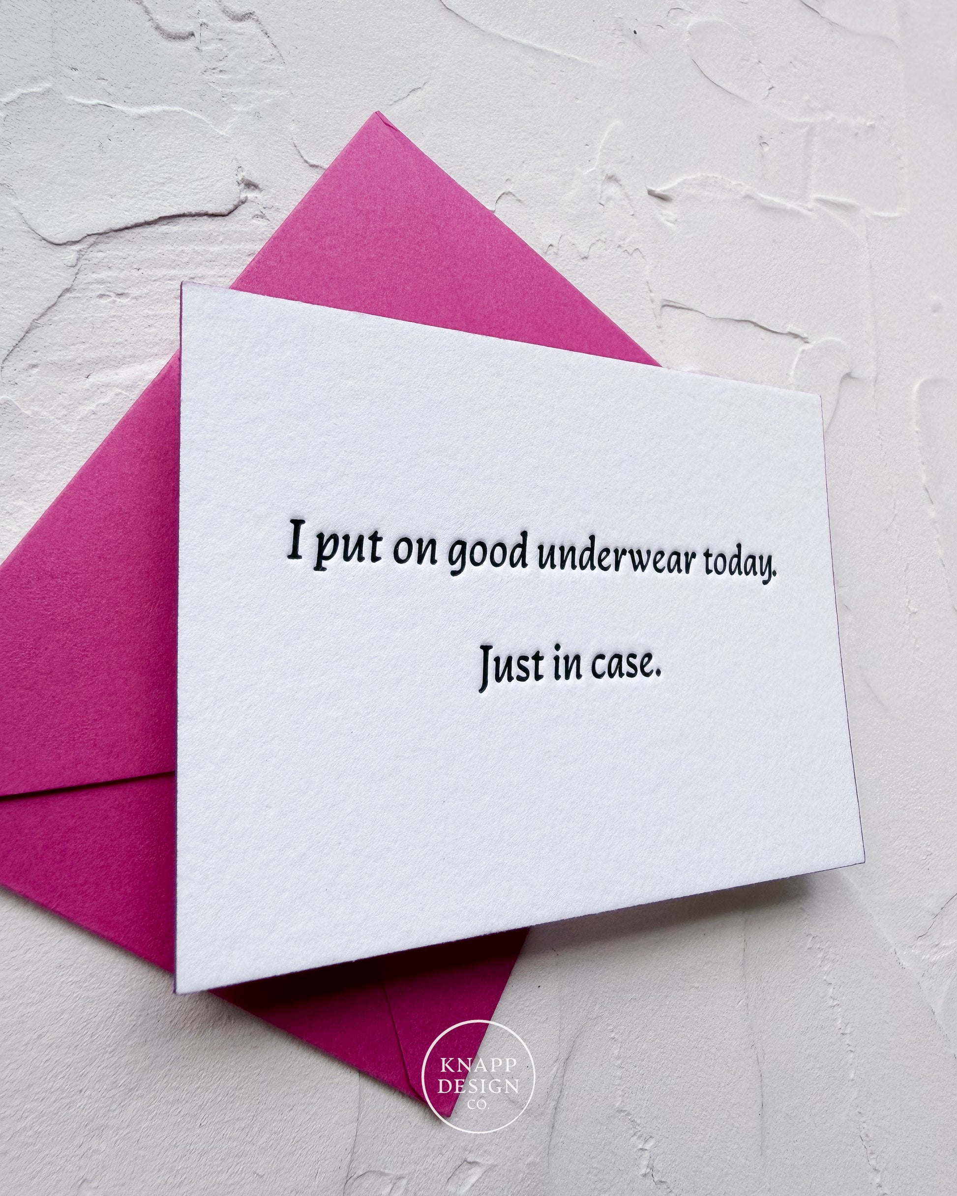 ♥️ Letterpress printed on one side with the phrase "I put on good underwear today. Just in case"
