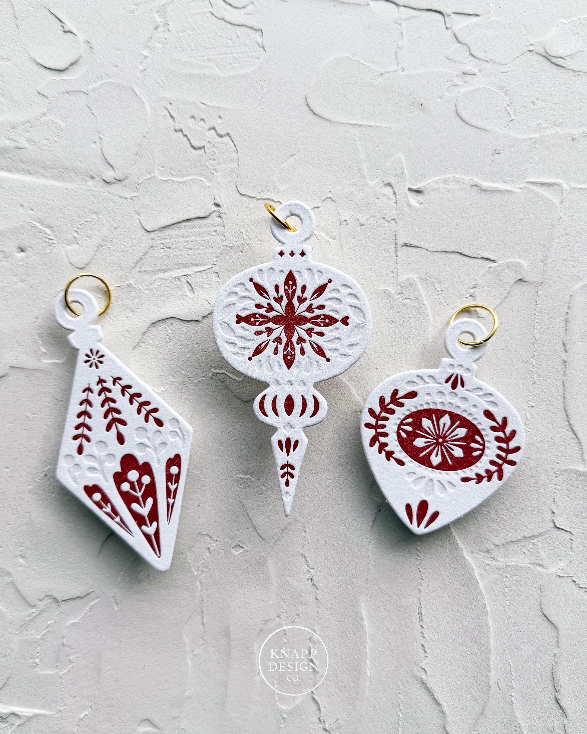 Each ornament was pressed on paper too small for other projects, and it gives that paper a second life.