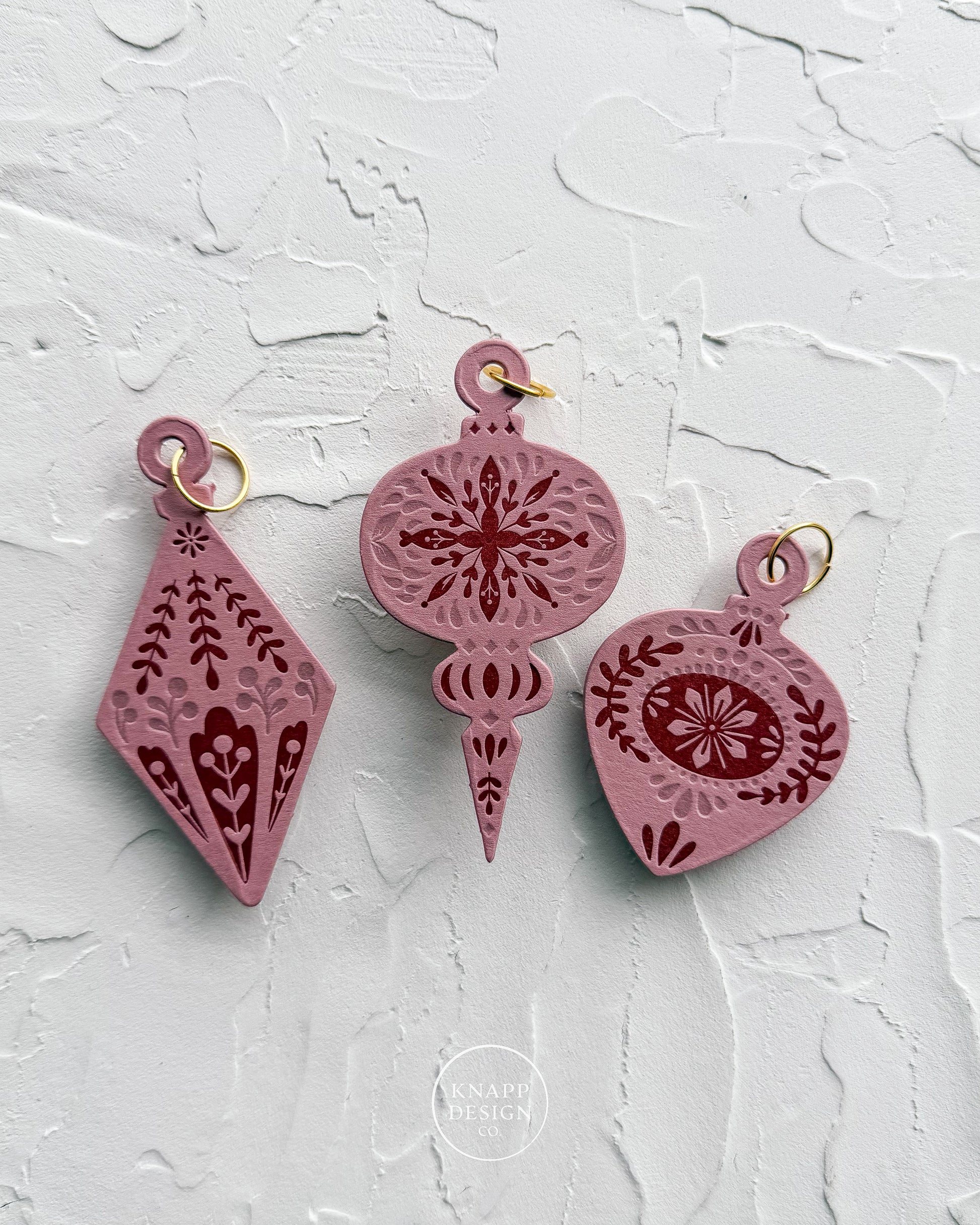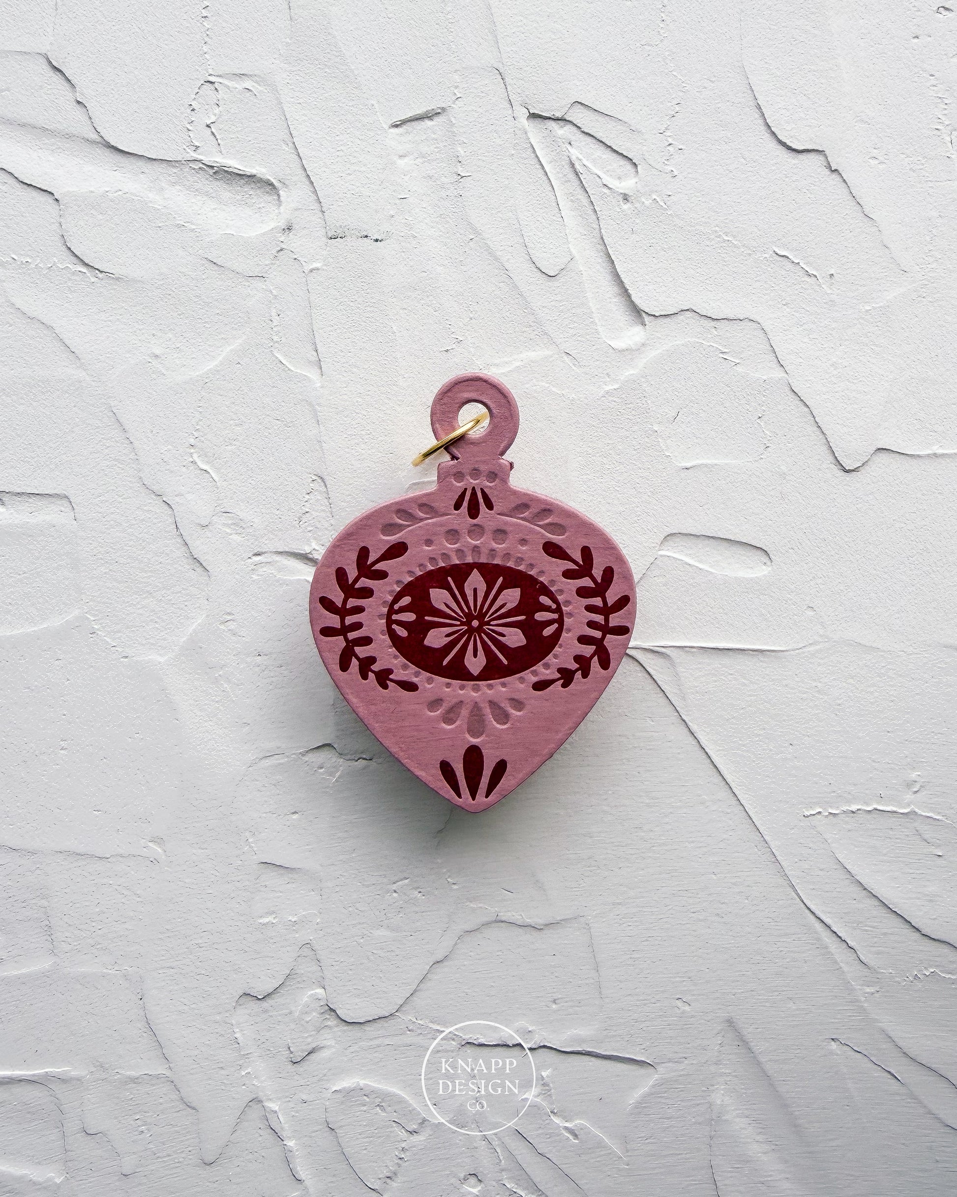 A nod to classic Scandinavian ornament design, this ornament features intricate letterpress impressions on thick lavender paper. Each ornament is pressed on both sides, in two colors, creating depth and texture, reminiscent of the charm of vintage glass ornaments.