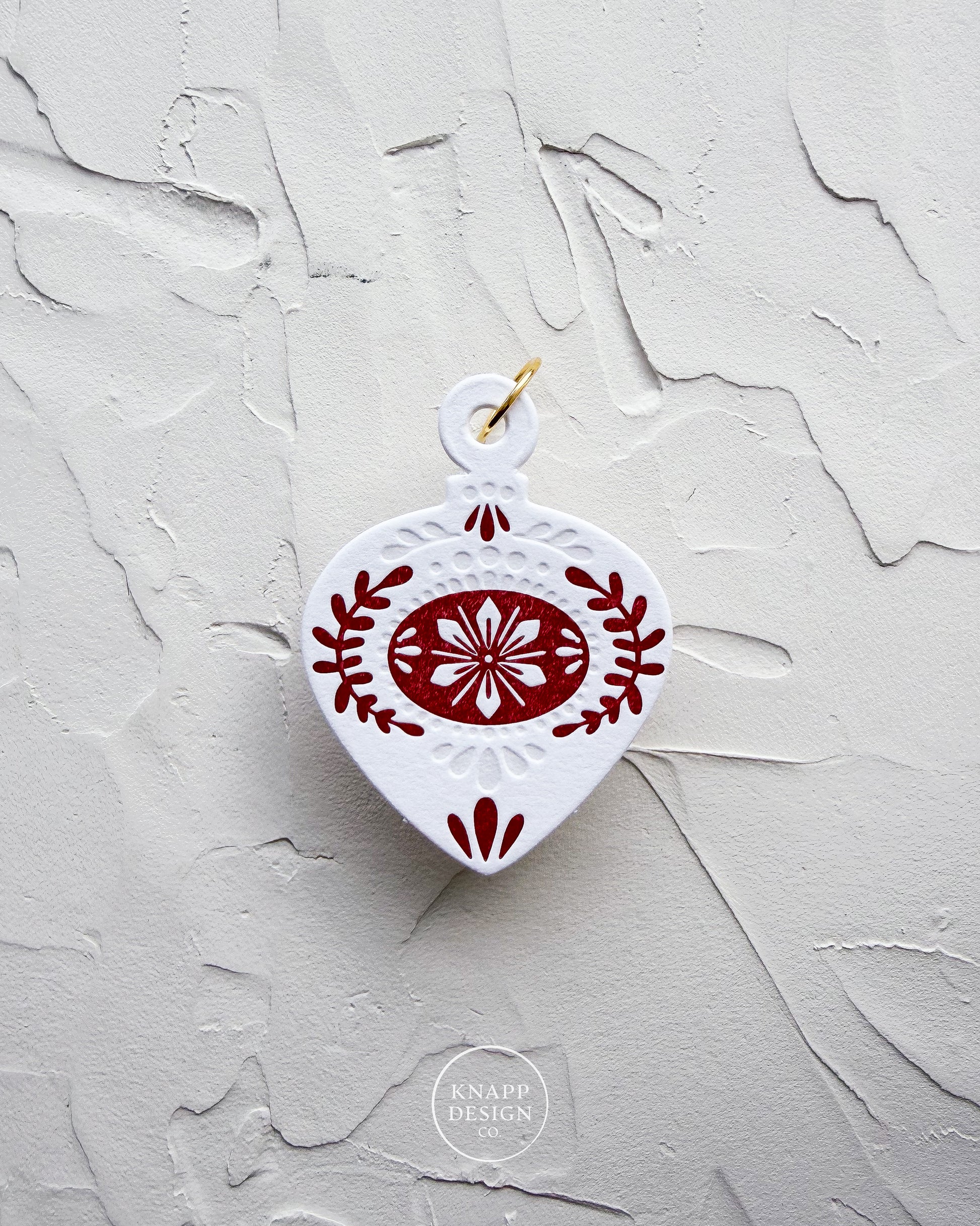 A nod to classic Scandinavian ornament design, this ornament features intricate letterpress impressions on thick lavender paper. Each ornament is pressed on both sides, in two colors, creating depth and texture, reminiscent of the charm of vintage glass ornaments.