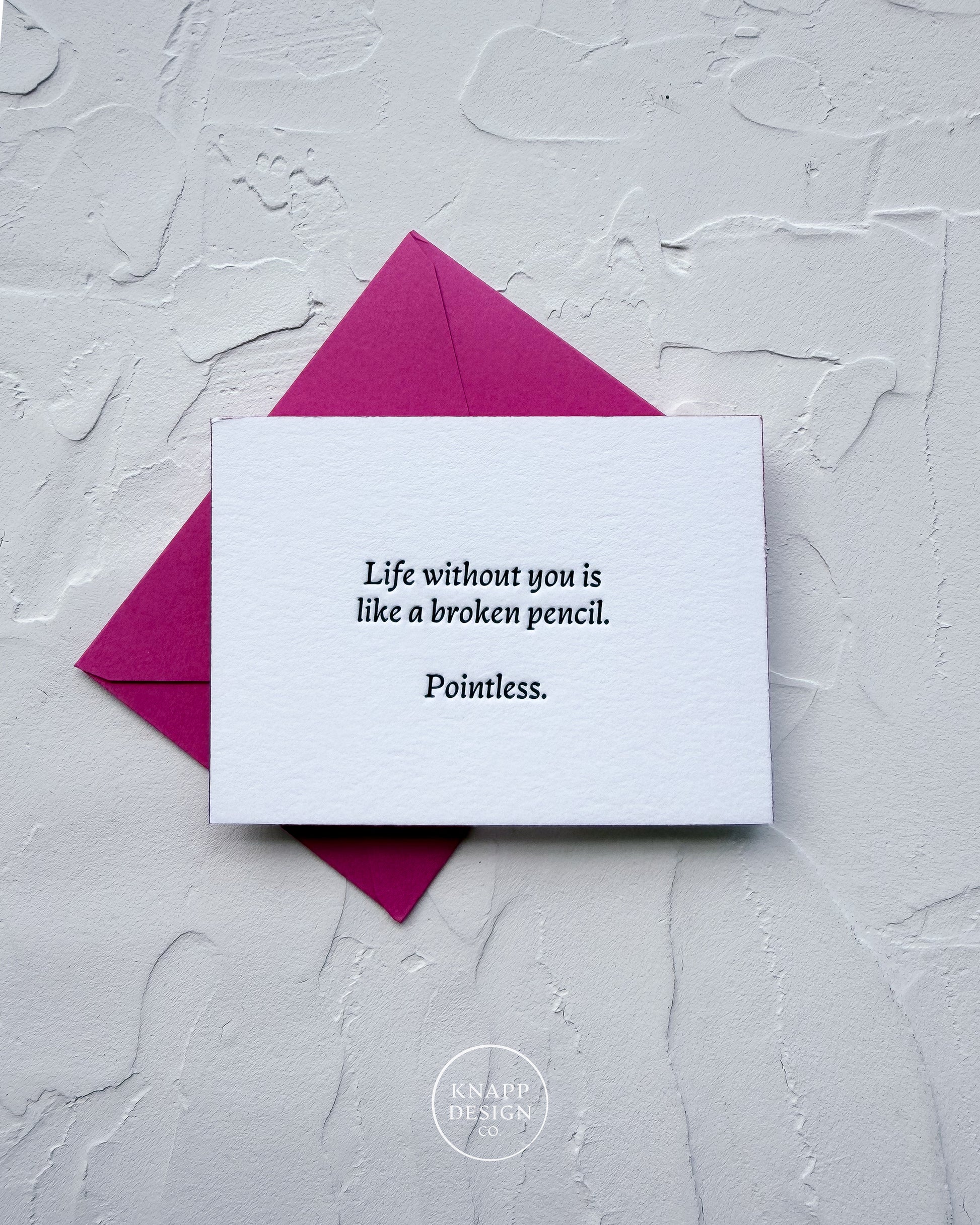 ♥️ Letterpress printed on one side with the phrase “Life without you is like a broken pencil. Pointless”