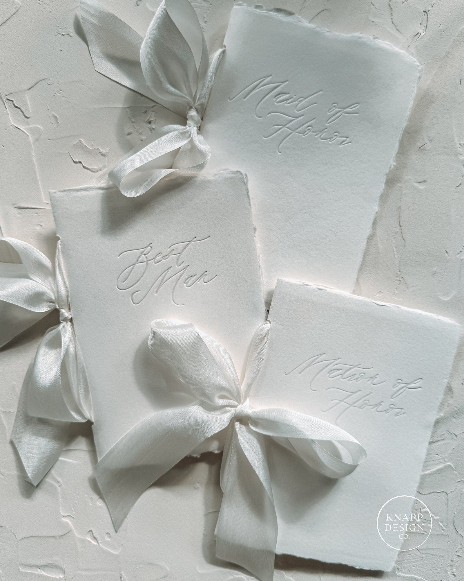 The perfectly sized toast book is made for once-in-a-lifetime words. Letterpress printed with “Matron of Honor” on handmade cotton paper and tied with silk ribbon, this heirloom-quality piece is the perfect way for you to share your toast with the newlyweds.