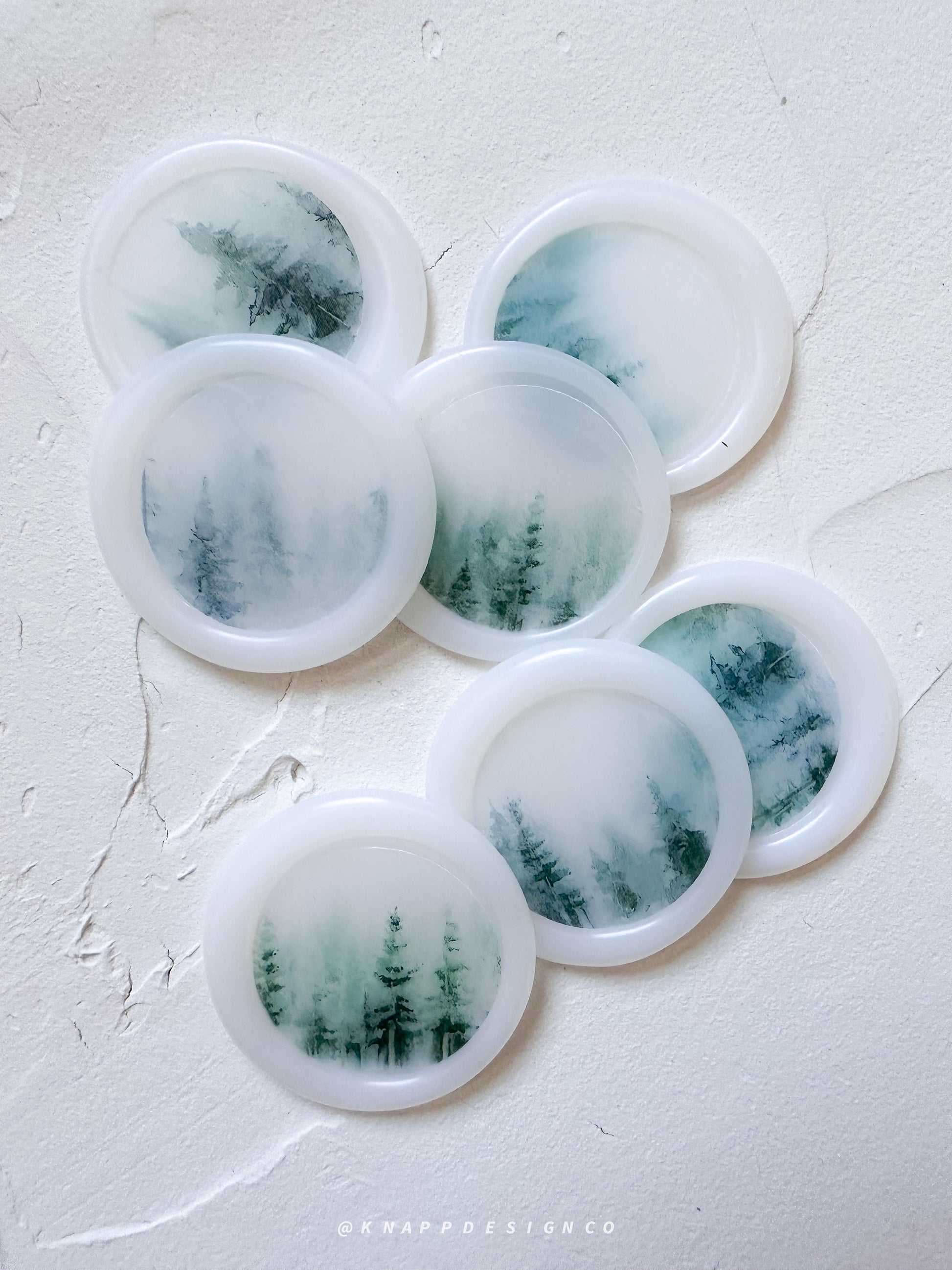 Cute wax seals with watercolor misty pine trees embedded in each seal.