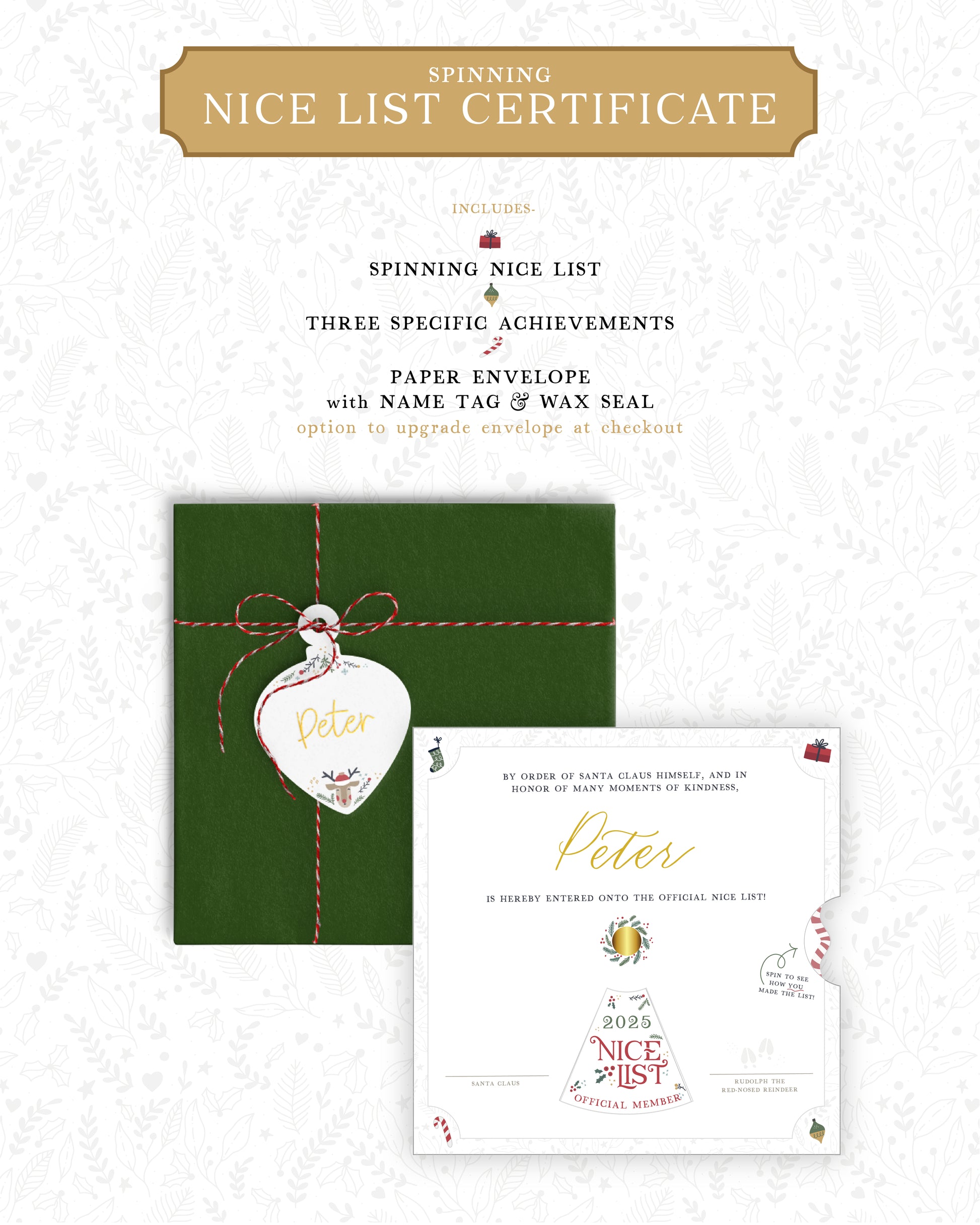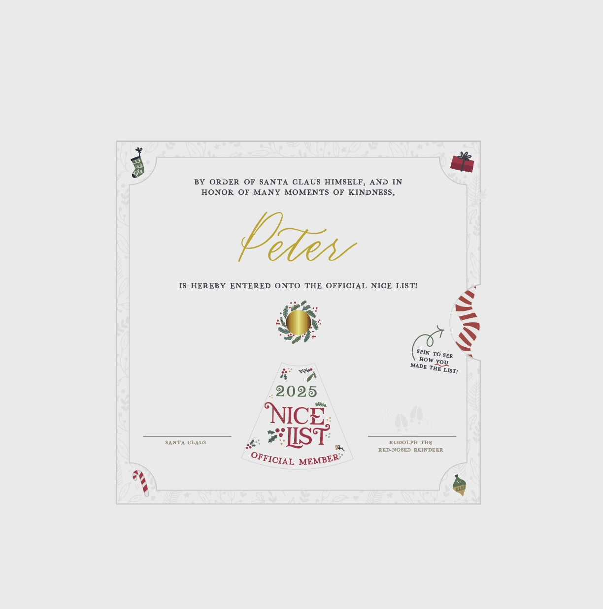 🎅 Spinning Nice List certificate, highlighting three specific achievements