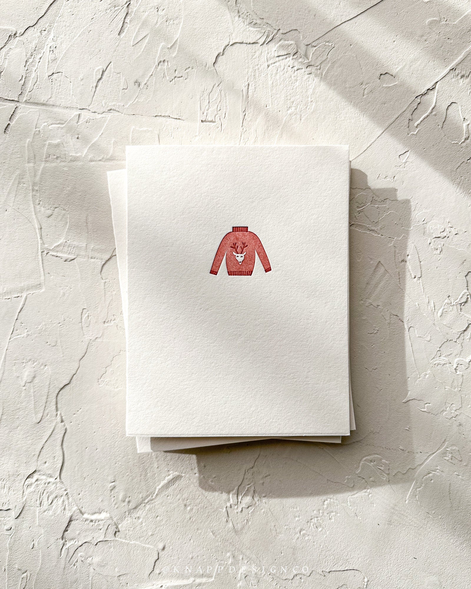 Cute and minimalistic holiday card with the cutest reindeer sweater illustration letterpress printed on a cotton card