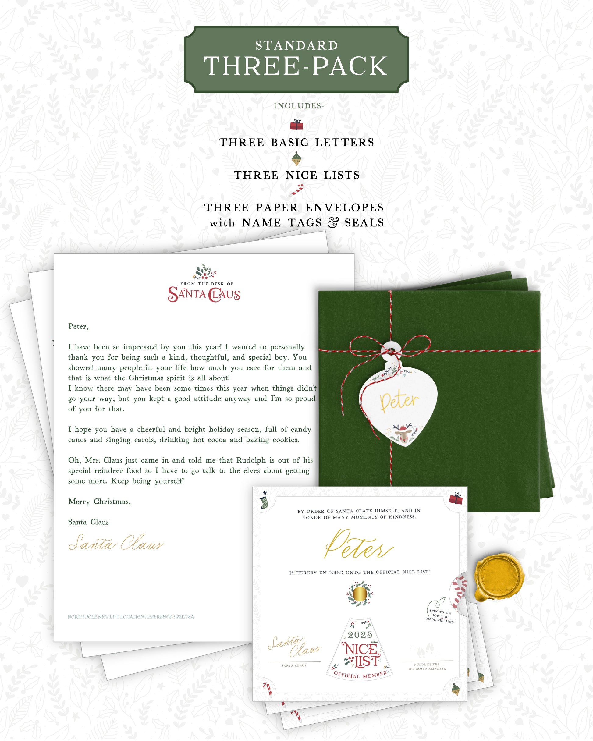 🎅 Each letter comes with a spinning Nice List certificate highlighting three specific achievements and a green paper envelope