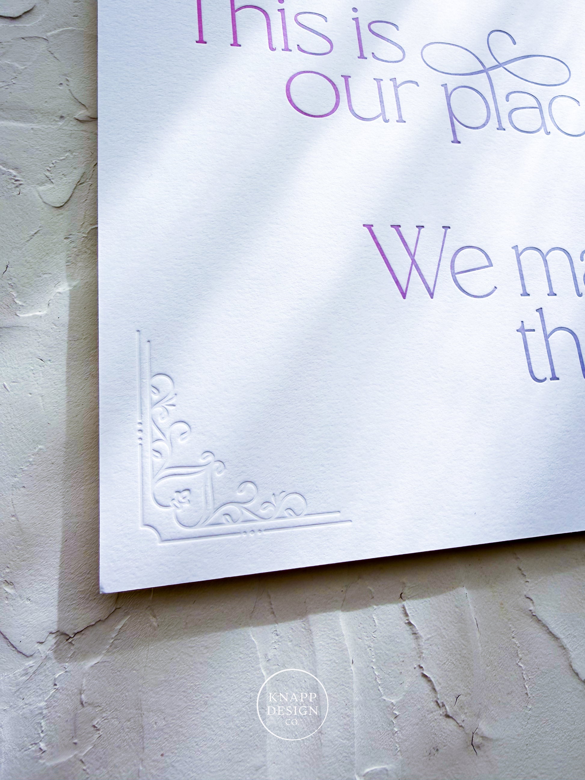 This Swift-inspired art print is for anyone who knows exactly where this lyric comes from. Printed on bright white cotton paper with a subtle design blind-debossed in the corners, with letterpressed words in a soft gradient for a subtle, elevated nod to “This is our place, we make the rules.”